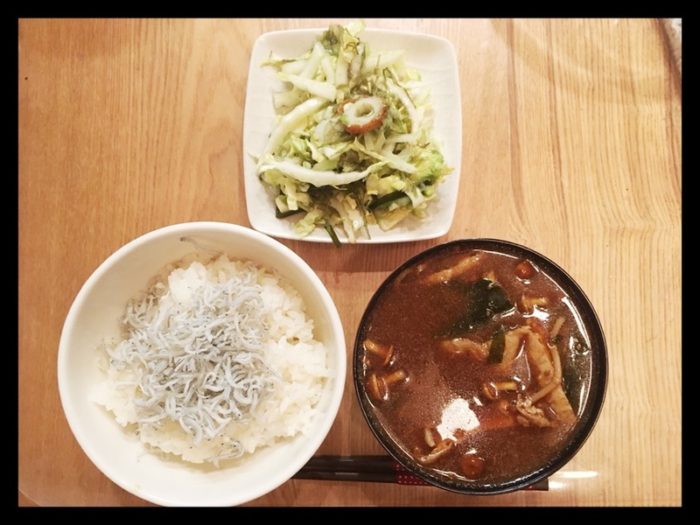 - なめことわかめとお揚げと蕎麦の味噌汁